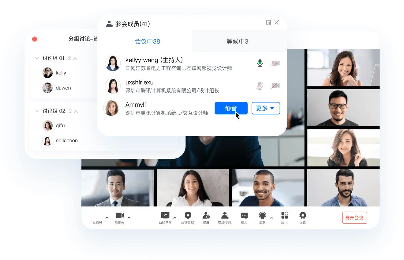 提供独立等候室,确保核心问题核心人员讨论;会中提供指定闭麦功能,会议期间不再聒噪