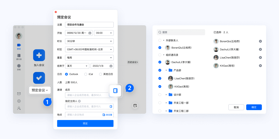 现在,赶紧在腾讯会议上创建您的组织吧!预定会议时,可以直接在通讯录勾选内外部联系人,日程将自动呈现在对方会议列表上,到点基于腾讯会议的响铃以及公众号等多渠道提醒,保证参会人准时上会。