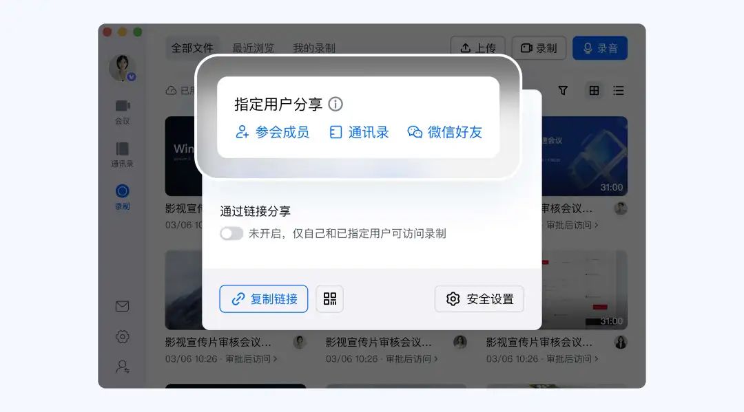 会后,您可以将云录制快捷分享给您的通讯录内外部联系人,对方直接在“腾讯会议客户端-录制”就能查看,既方便又防止云录制链接泄露。