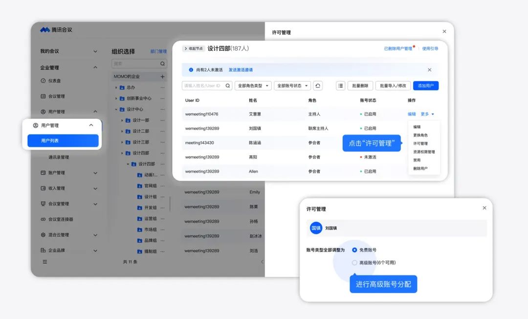 对此,会议君推荐由企业管理员按需统一购买腾讯会议的高级账号,并分配给有需要的员工,这样就可以实现: