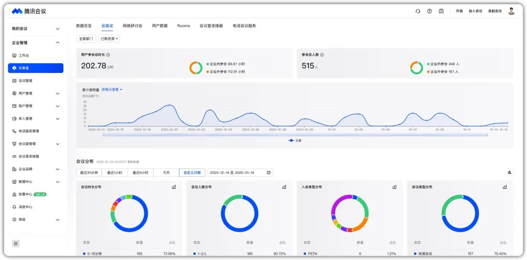 ○ 企业管理后台:企业可根据使用情况提前配置会议账号资源。为了帮助大中小规模各类企业都能更好地运营企业会议资源,现在专业版、商业版、企业版的组织均提供了企业管理后台,可以进行用户、账户等管理操作,让资源合理流动,高效运营。