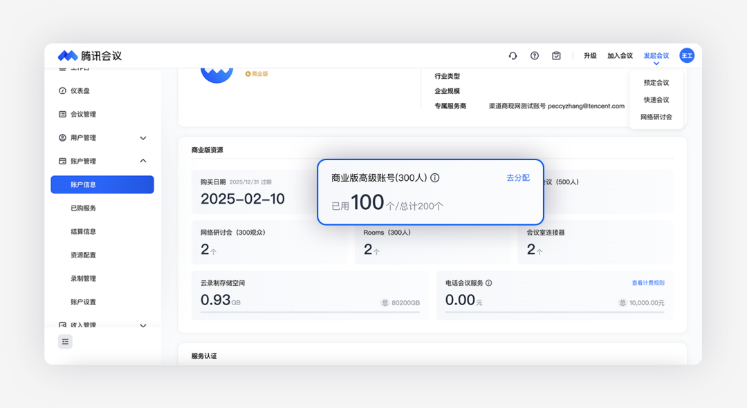 对此,会议君推荐由企业管理员按需统一购买腾讯会议的高级账号,并分配给有需要的员工。在企业管理后台,可以清晰的看到企业资源情况:
