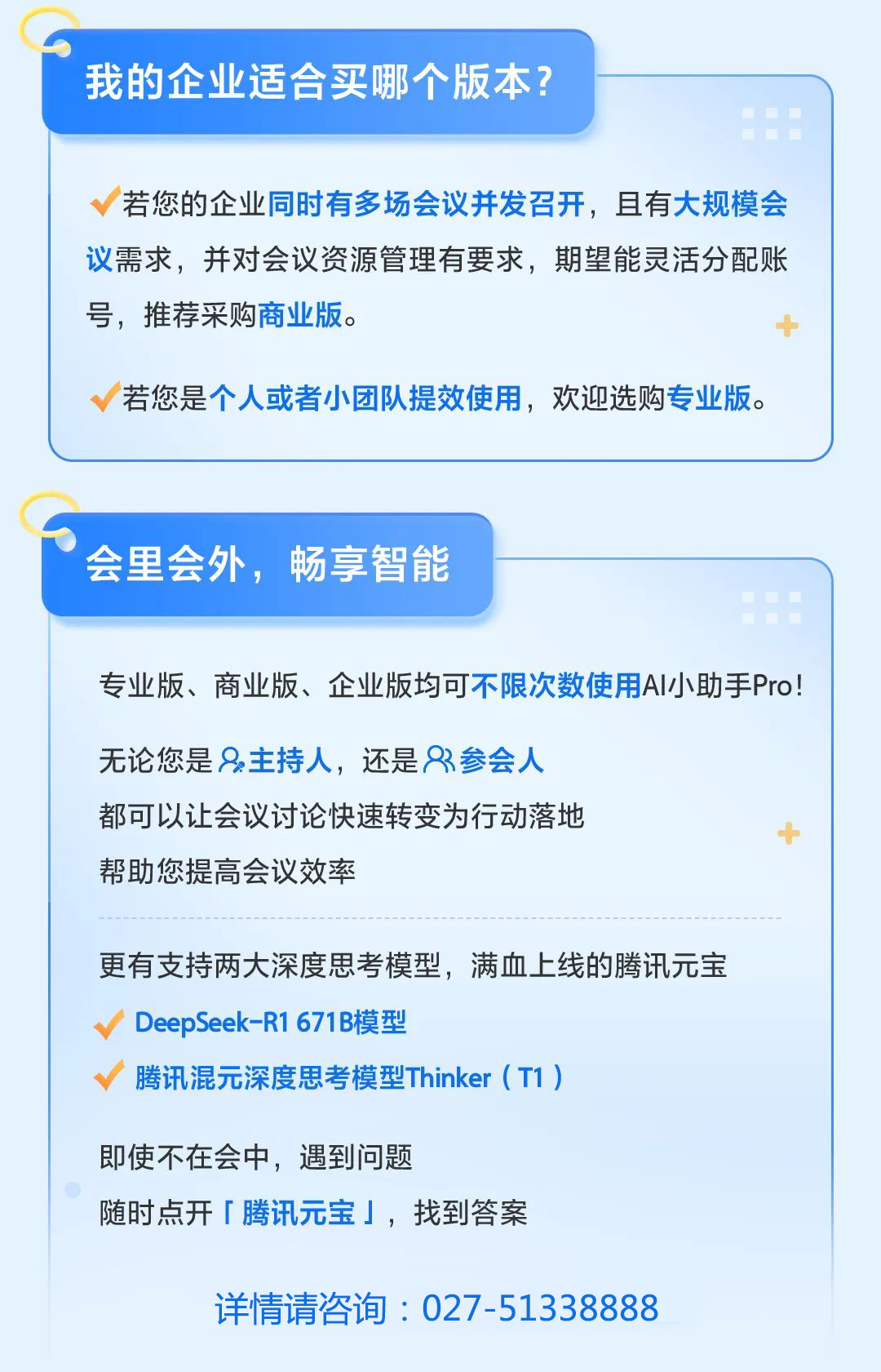 - 企业部门多起来,高级账号配置不足容易会议冲突耽误业务进度;