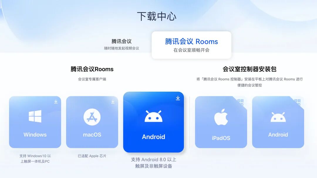 此外,现在除了Windows10以上版本的触屏一体机和PC、Mac OS系统的设备外,Android8.0 以上触屏及非触屏设备都可安装使用腾讯会议Rooms来开会、投屏啦,为您提供更稳定、流畅的会议体验,且支持通用遥控器操作、手机扫码控制。