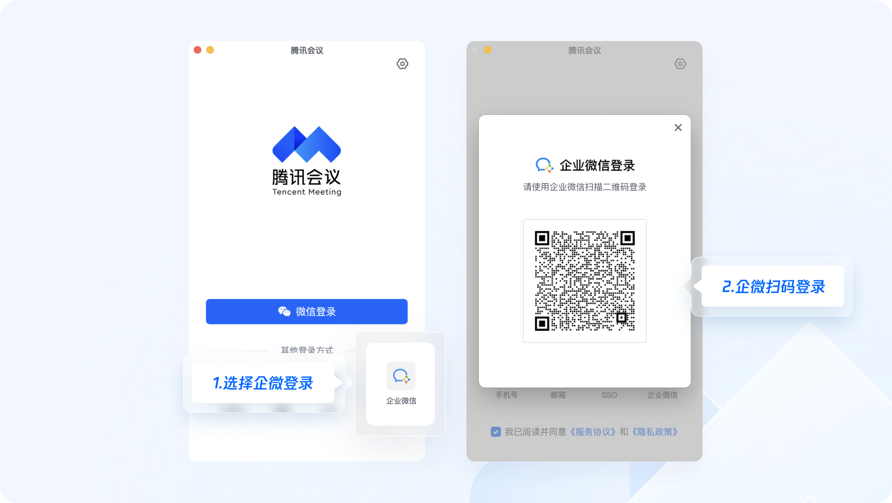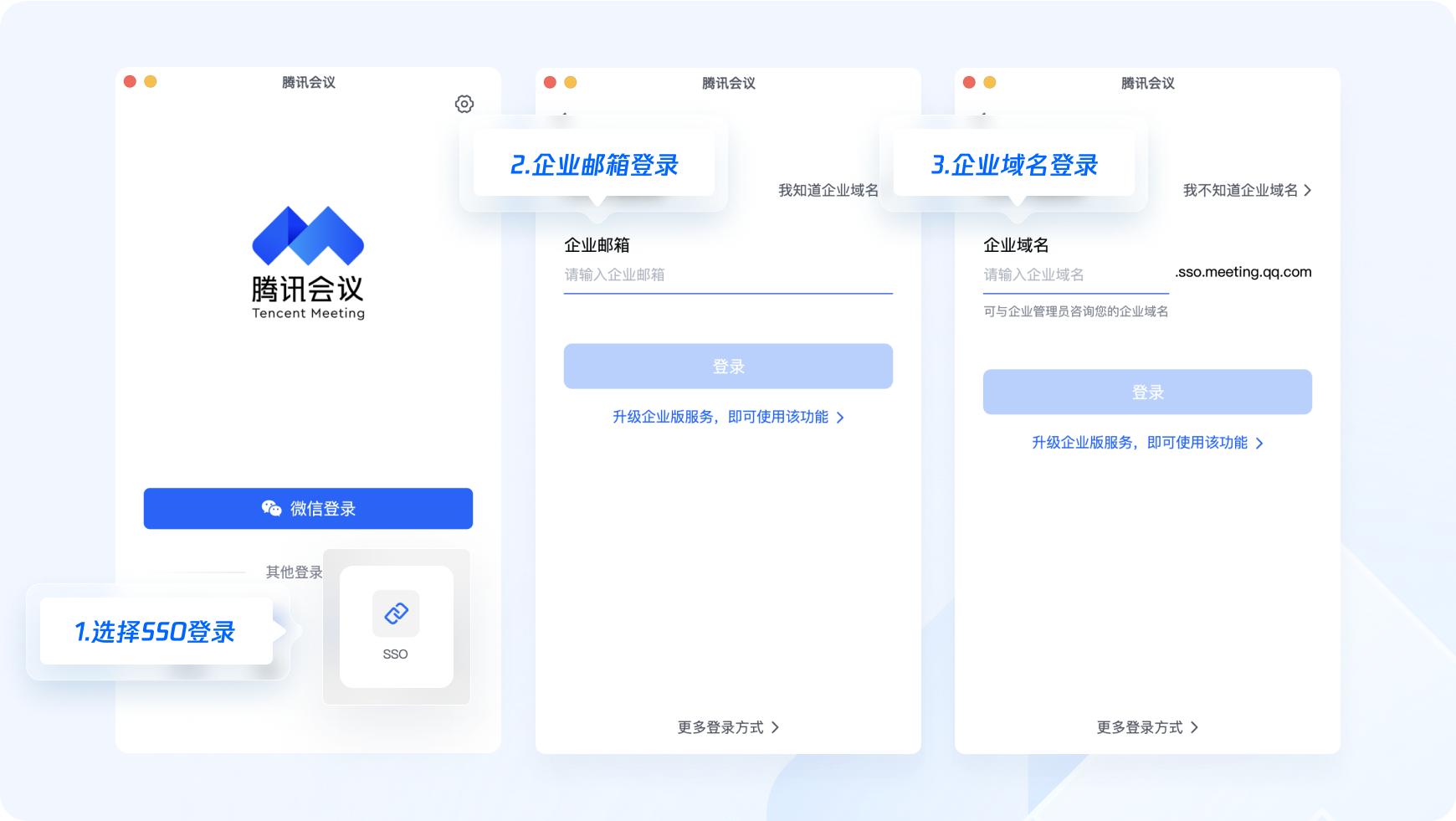 您可将腾讯会议对接到已有的组织/企业账户认证体系中,通过SSO,输入企业域名或企业邮箱,即可登录腾讯会议。