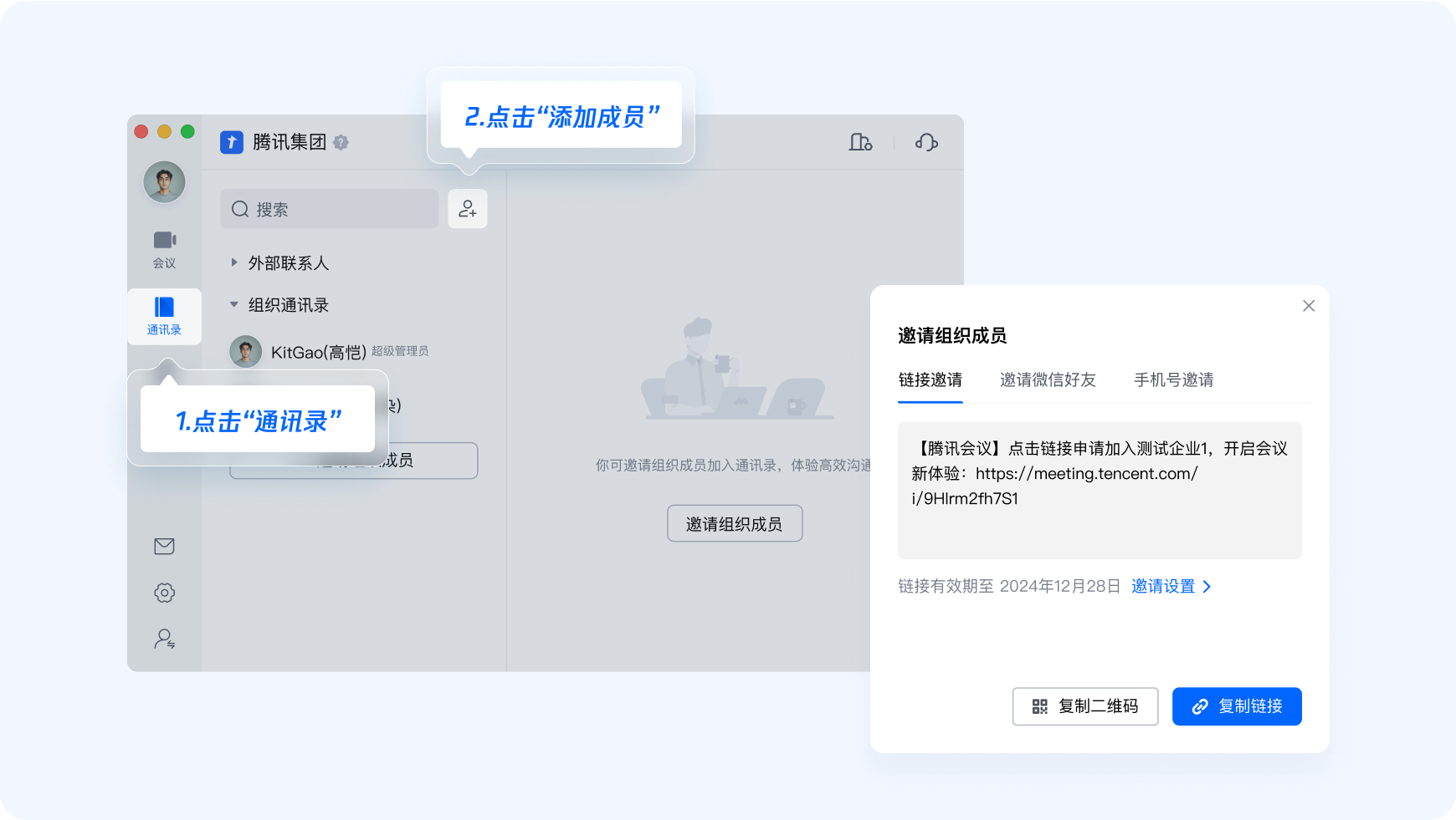 作为企业管理员,您可以在腾讯会议APP、官网通过名单导入、企业通讯录对接等方式邀请成员进入组织,企业管理员将拥有专属的【企业管理后台】,以实现更好的会议资源分配、管理和运维,让组织成员高效协作。