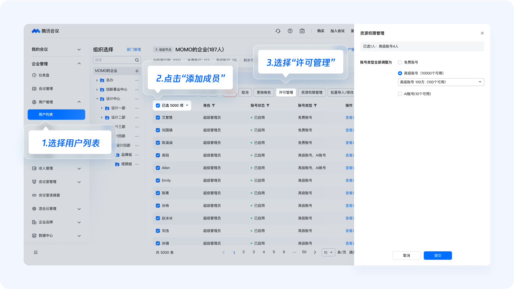 企业已购买的会议资源,需要分配给企业员工或部门,前往官网或APP进行资源分配,让员工开启一场高效的远程沟通吧!