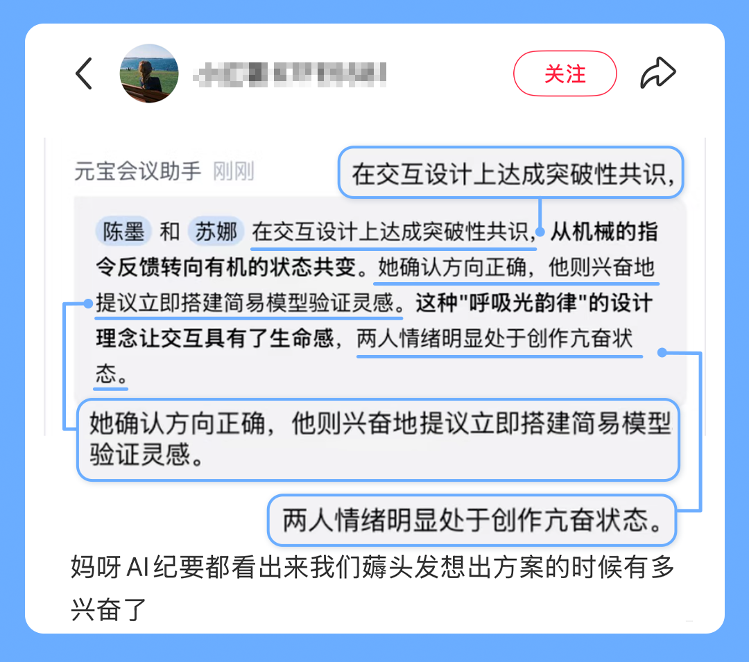 AI纪要记得你和团队的那次头脑风暴会议,讨论到中途陷入了短暂的沉默,重要的思考往往发生在这里——当那个亮点方案逐渐浮现时,AI纪要记录下了你们欢呼雀跃的心情。