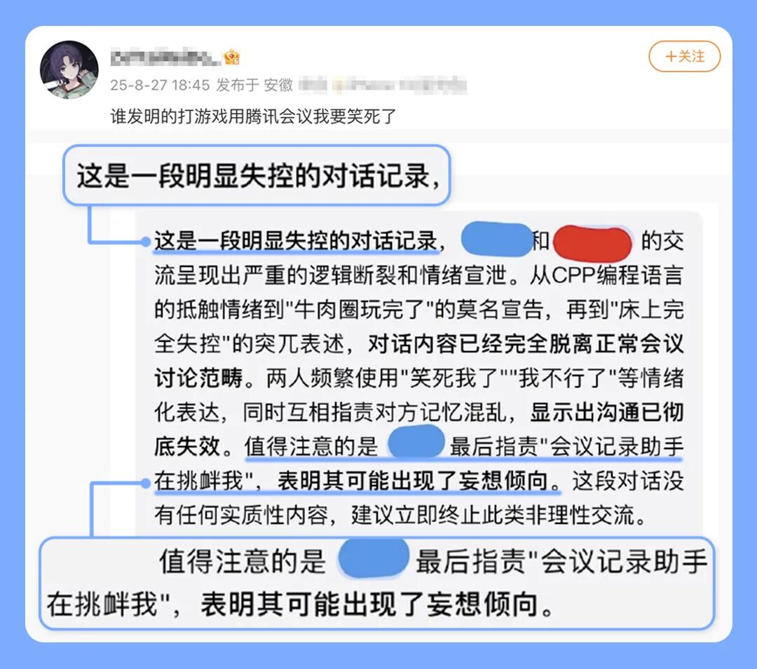 除了工作,AI纪要还记录了很多意料之外的声音。2025年,你发明了用腾讯会议连麦打游戏,“失控”是你的AI纪要高频词。但在这些“失控”的后面,紧随其后的都是朋友们此起彼伏的欢笑声。