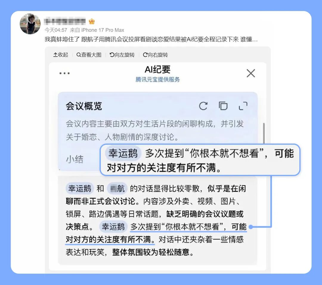 有时候,AI纪要也会因为洞察到的情绪过于强烈而给出“有思考”的建议。比如这位朋友发现,AI纪要曾在自己和朋友连麦画画的时候,建议暂停议程先处理情绪问题。